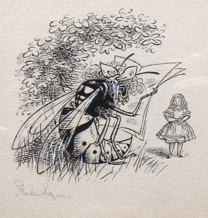 One of the best sites I found while looking into Baynes' life and work was Brian Sibley's blog, which includes something thrilling for a Lewis Carroll enthusiast like me. Pauline did a small line drawing for the "lost" chapter of Through the Looking-Glass and What Alice Found There. The chapter involves a wasp with a wig reading a newspaper, and Sir John Tenniel said he couldn't illustrate such a thing. The nerve! Sibley was a close personal friend of Baynes near the end of her life, so his blog post about her is really interesting.